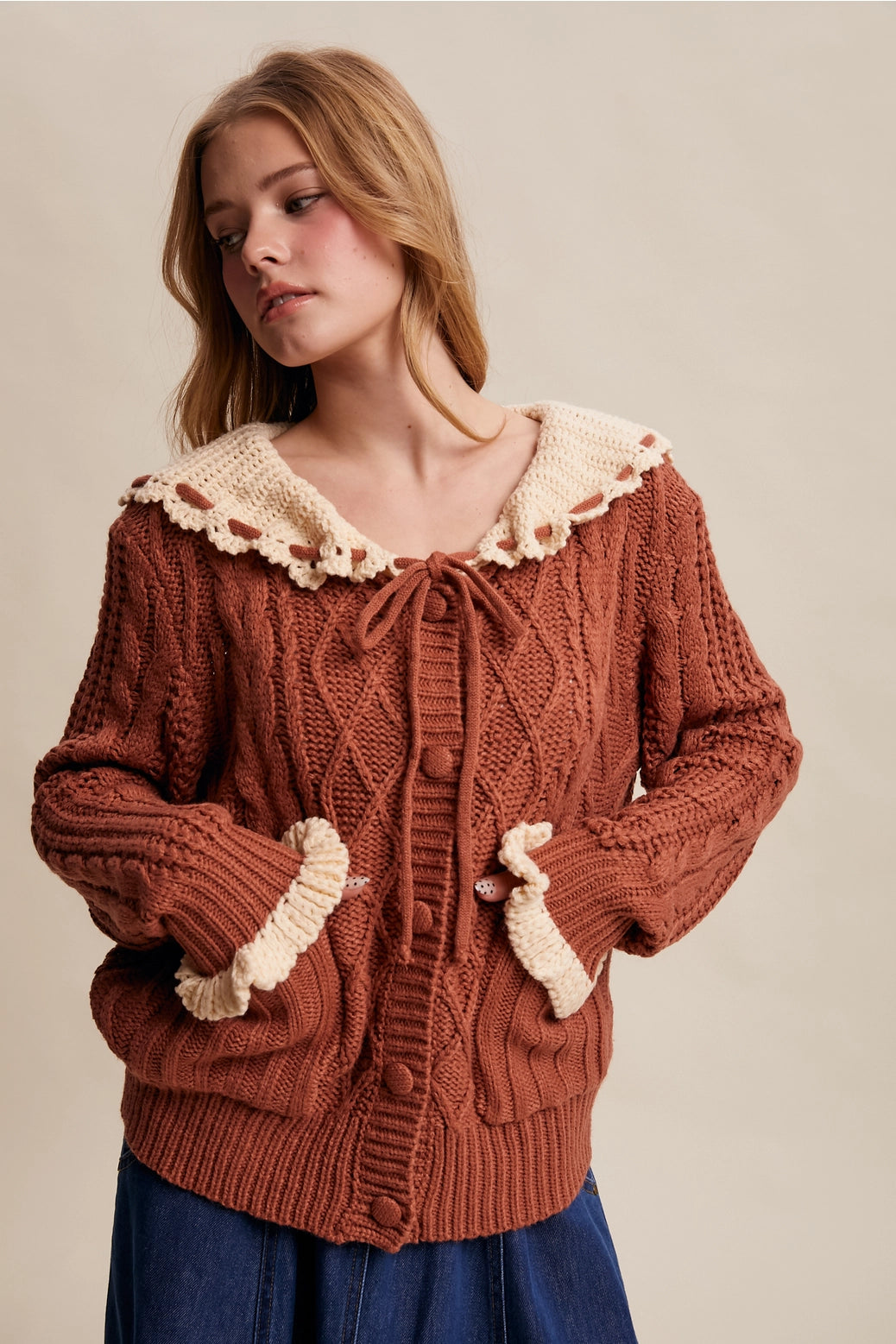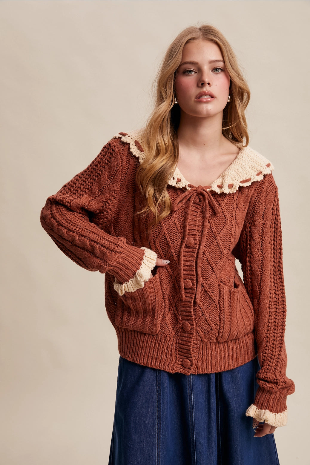 A nostalgic cardigan with charming crochet accents and cozy texture-perfect for layering with your favorite romantic looks.