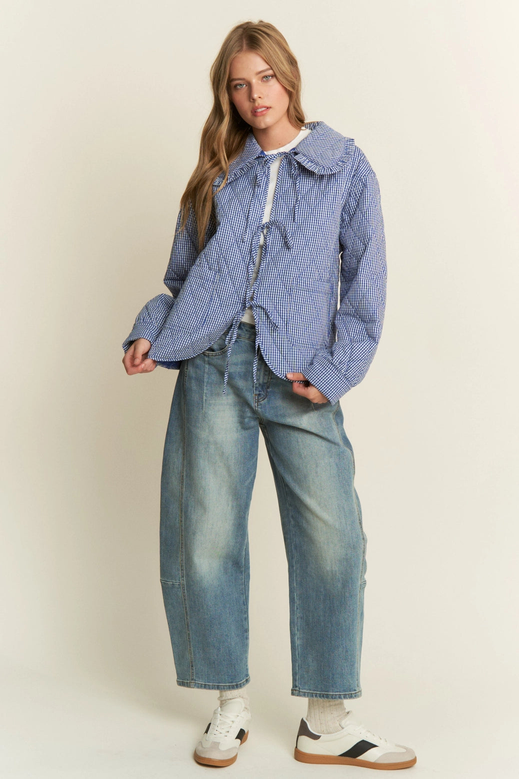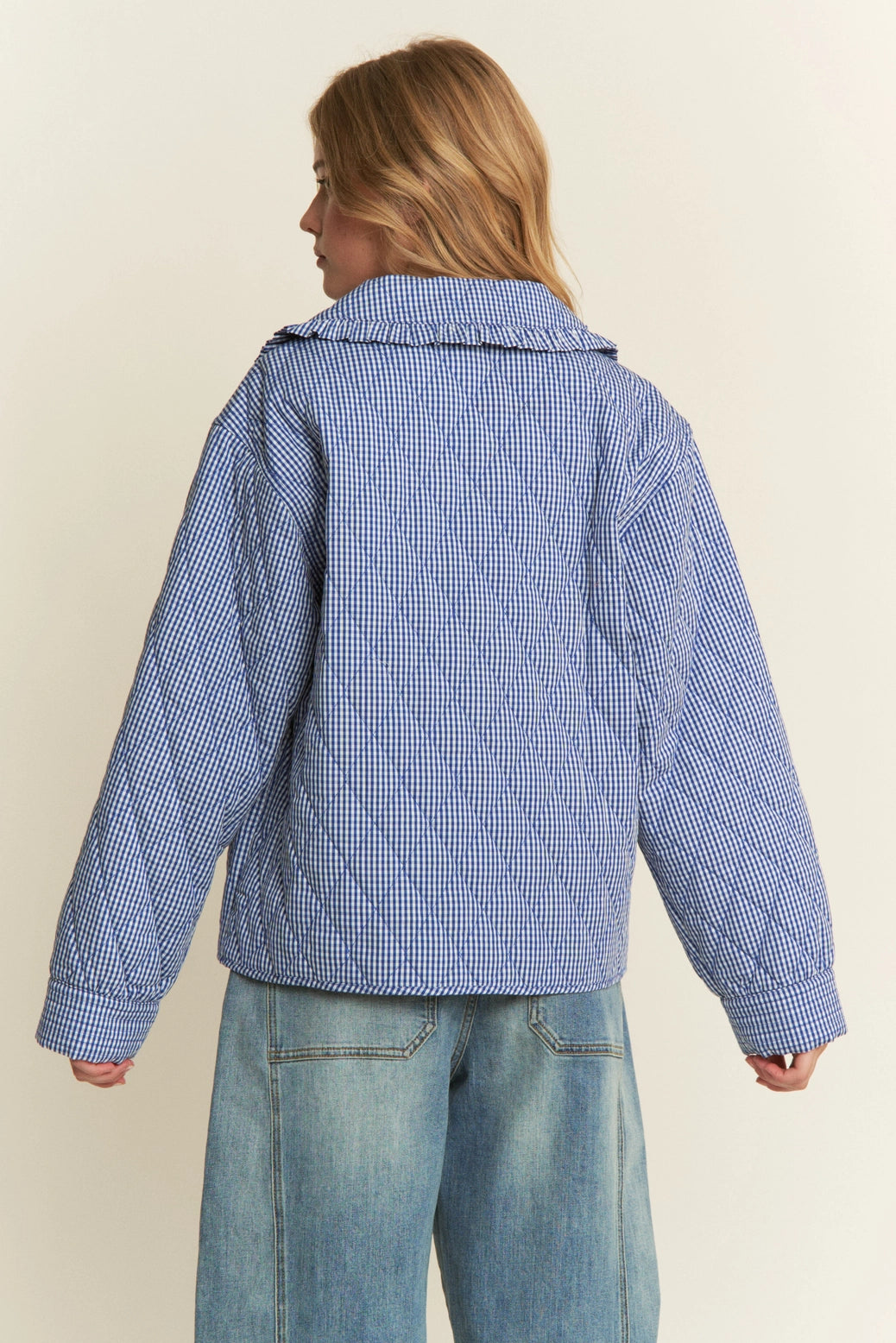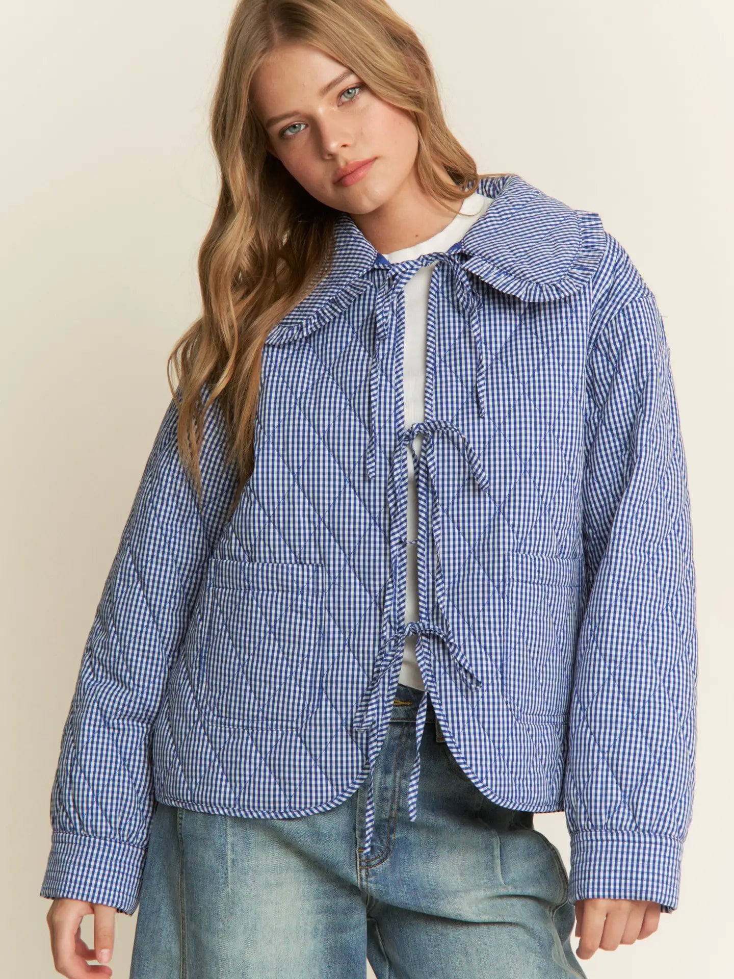 Gingham print jacket with soft quilted texture. Oversized rounded ruffle collar, tie front., and front pockets. Jacket has is lightweight and 100% cotton